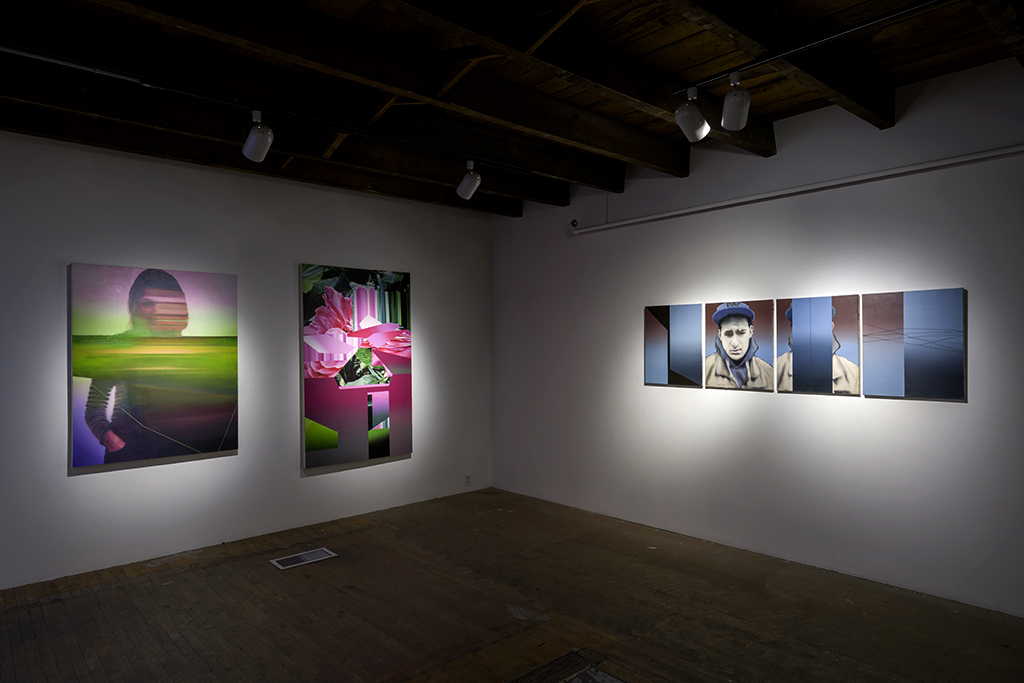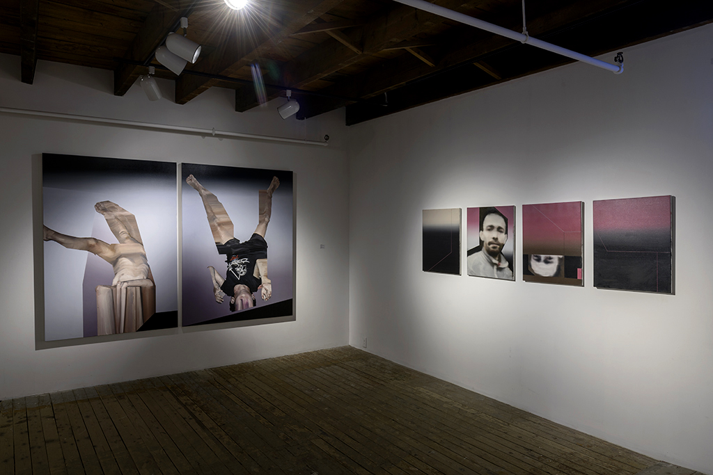 Les toiles de Plan B peuvent être lues comme le récit de la dématérialisation progressive de mon ancienne vie en Tunisie, qui devient virtuelle au fur et à mesure que je m’en éloigne, aussi comme le récit de mon arrivé dans à Montréal, environnement encore virtuel pour moi, n’y vivant que depuis peu. Les sources photographiques utilisées sont celles d’un ami proche pris en photo chez lui et grâce à qui j’ai pu partir, un passant de l’avenue Bourguiba où je passais beaucoup de temps, la photographie trouvée dans la presse locale des vendeurs de fleurs de la même avenue où j’ai acheté un bouquet le jour de mes fiançailles, une rose du jardin de ma mère, mes deux neveux en vacances, le portrait du Premier ministre de la Culture post-révolution, le premier achat vestimentaire de mon épouse à Montréal, mon nouveau quartier à Montréal, la photo de Sam Hamad dans le journal Metro, etc.