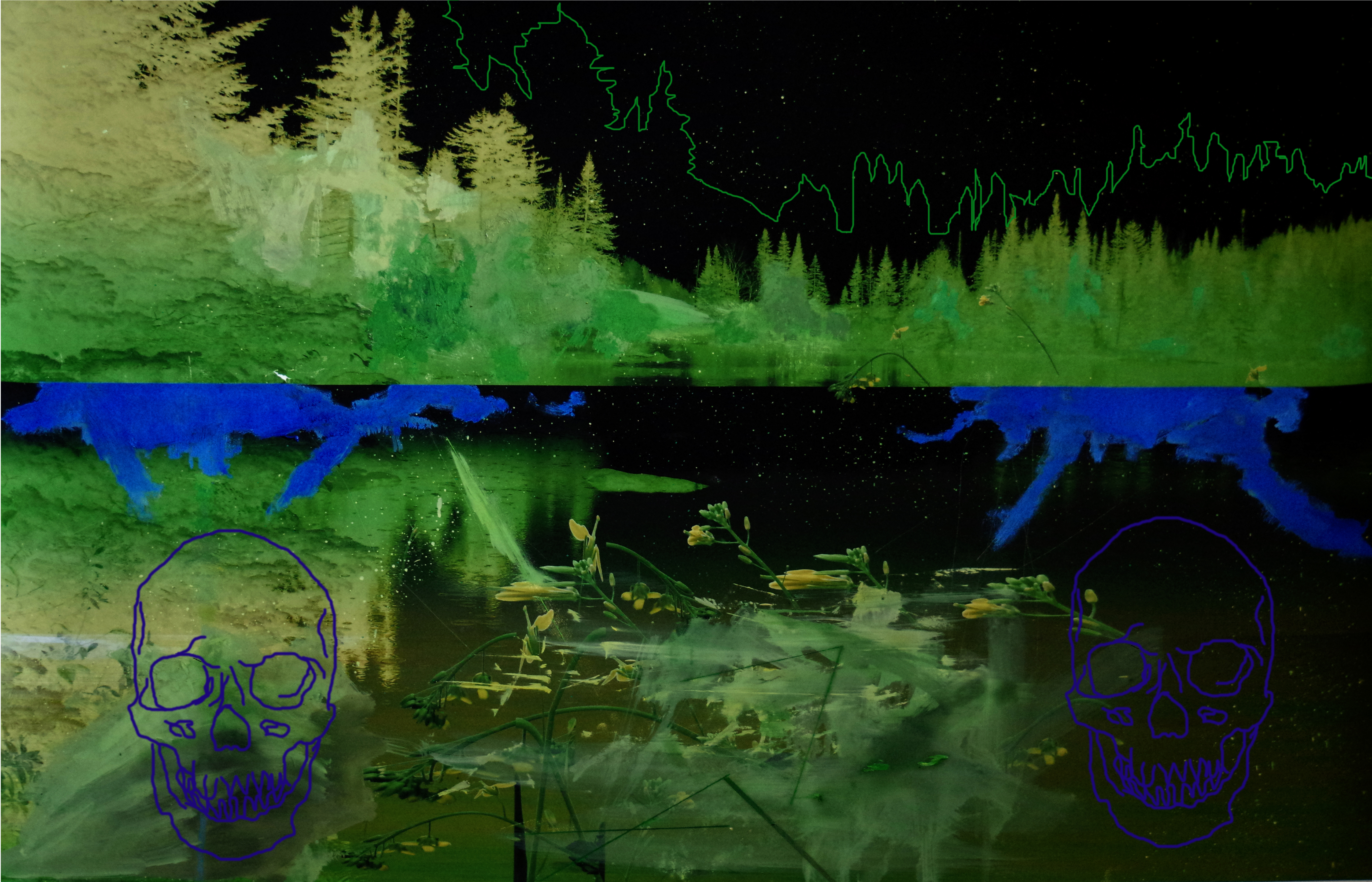 Previous ImageNext Image 21 Lac, fleurs, aube, crâne, 2019, peinture à l’huile sur impression numérique, 67 x 101 cm