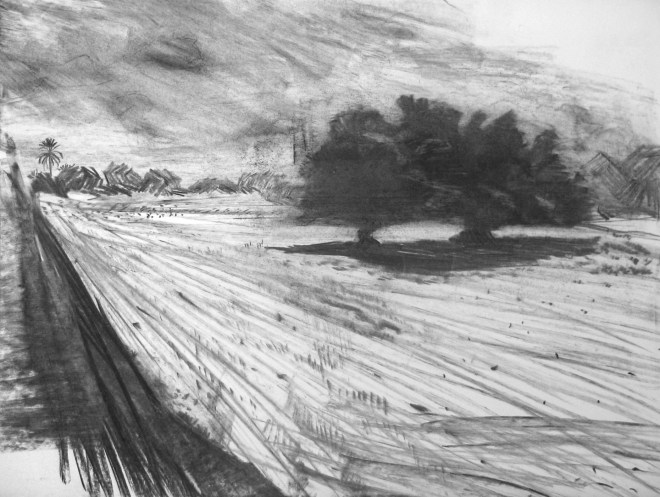 Previous ImageNext Image Vue de Djerba (olivier et vent de sable), 2007, fusain sur papier, 50 x 60 cm