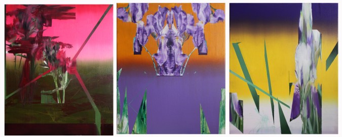 Previous ImageNext Image Champ 1 (oeillet et iris), 2018, huile sur toile, 3 élément de 50 x 60 cm ch.