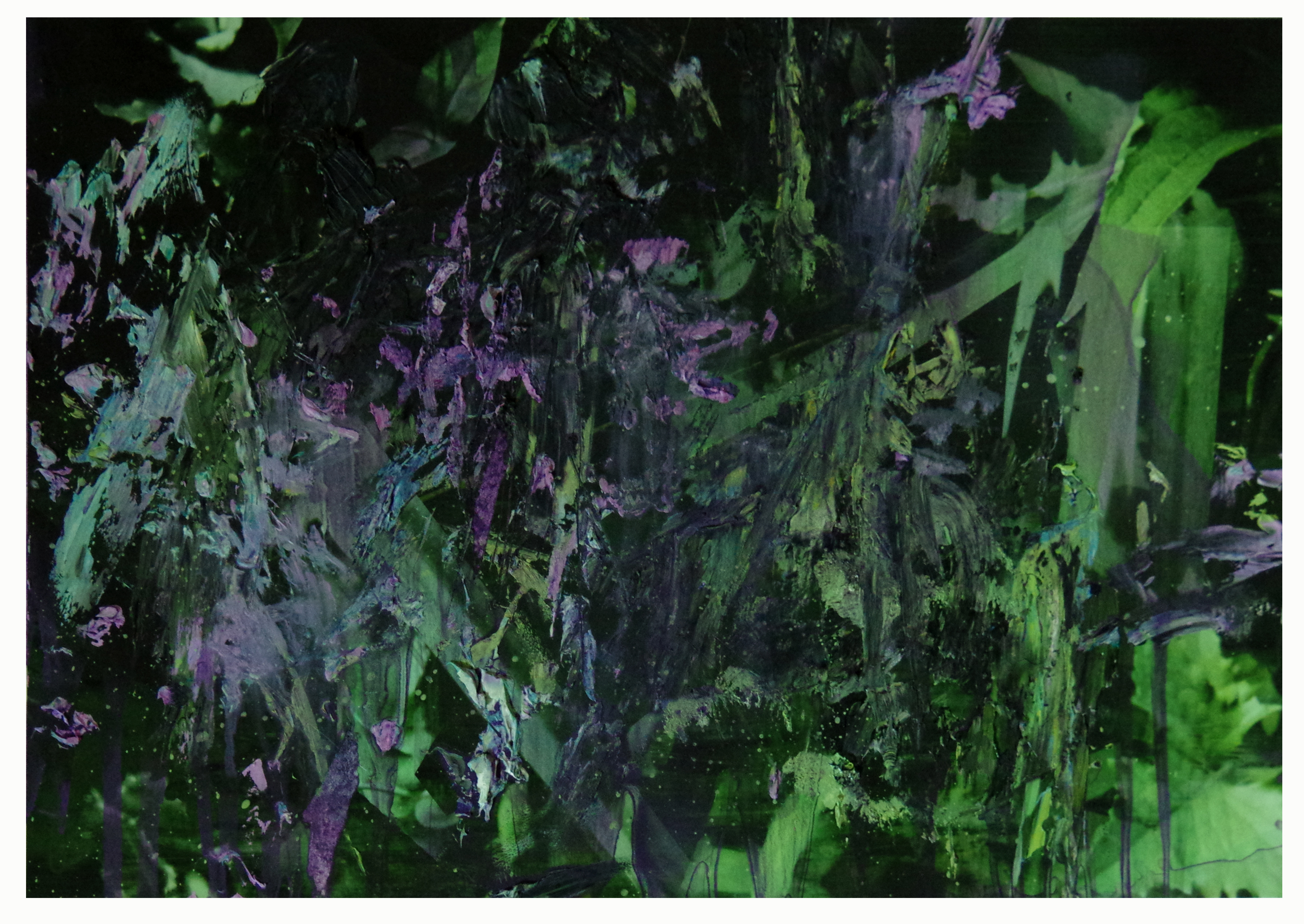 Previous ImageNext Image buisson mauve et vert Buisson, 2019, peinture à l’huile sur impression numérique, 30, 5 x 46 cm